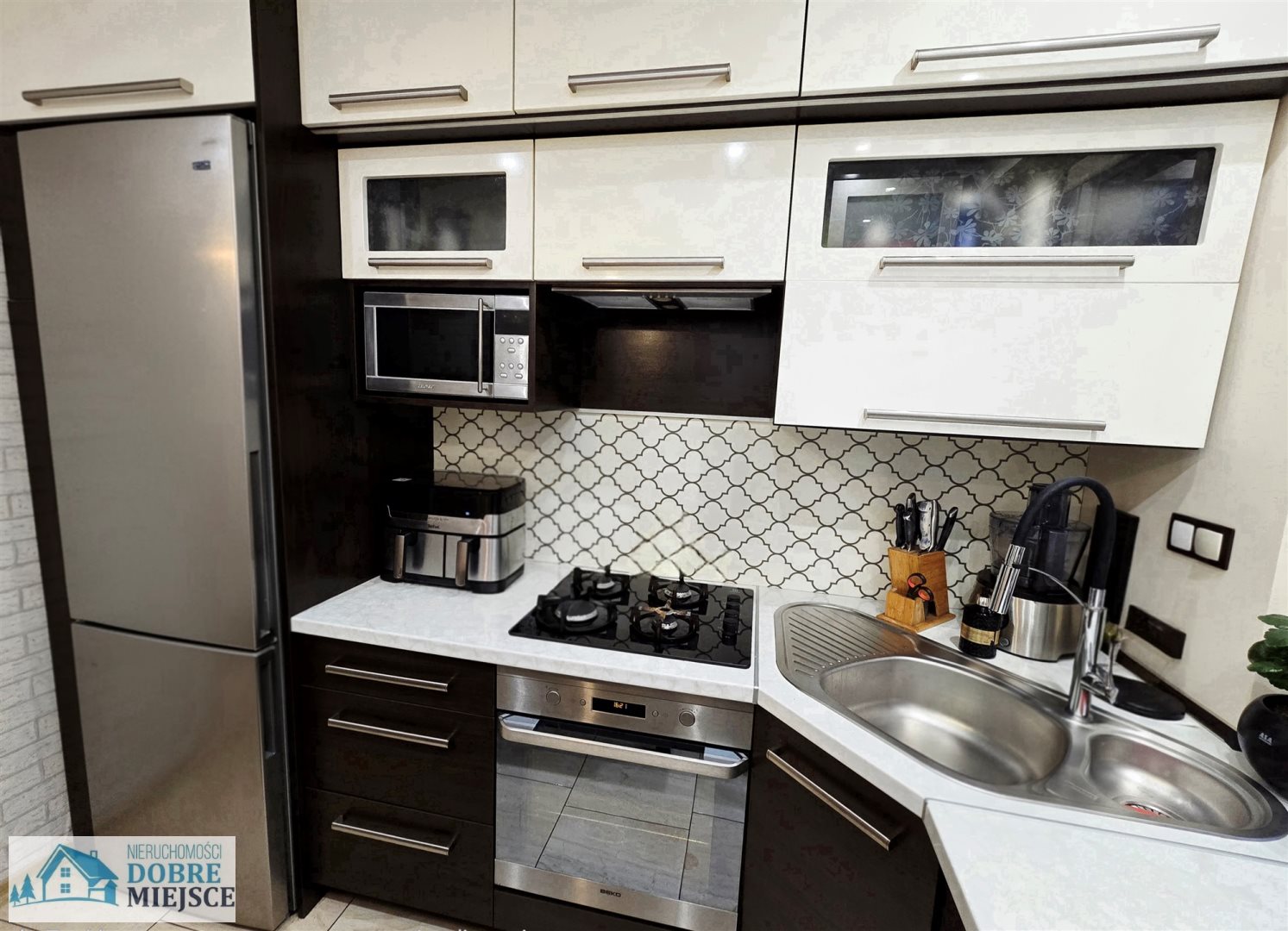 Funkcjonalnie rozplanowana kuchnia o powierzchni około 7 m² to prawdziwa perełka dla miłośników gotowania . Nowoczesne meble na wymiar skrywają pełne wyposażenie AGD , w tym zmywarkę, lodówkę, okap oraz efektowną szklaną płytę gazową połączoną z piekarnikiem elektrycznym. Dzięki przemyślanemu projektowi z dużą ilością blatu roboczego oraz miejscem na spory stół, jest to idealna przestrzeń na wspólne śniadania przed pracą czy szkołą. Całość dopełniają eleganckie, duże kafle na podłodze oraz ozdobna tapeta, która dodaje wnętrzu przytulności.